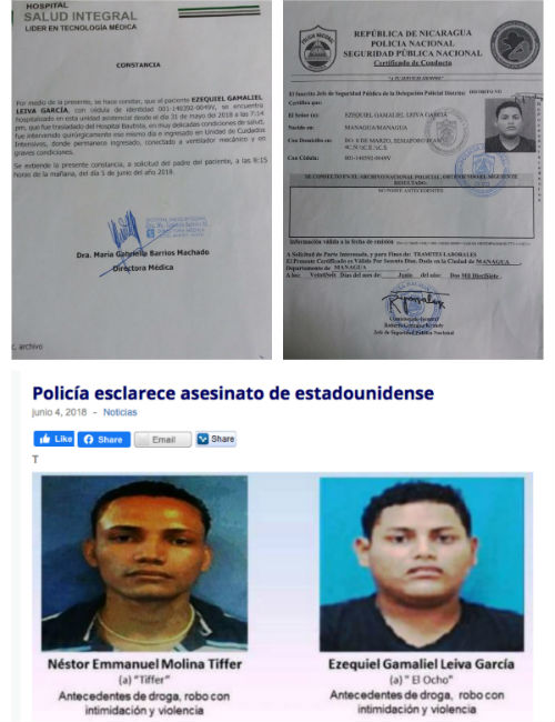 De manera sorprendente, cuarenta y ocho horas después de que la embajada de Estados Unidos lamentara los hechos, la Policía de Nicaragua señaló a los supuestos responsables del crimen: Ezequiel Gamaliel Leiva García y Néstor Enmanuel Molina Tiffer. Eran dos desconocidos, cuyos nombres se sumaban al cúmulo de sucesos violentos ocurridos en el contexto de las protestas. Hasta entonces habían muerto 108 personas según los datos del Centro Nicaragüense de Derechos Humanos (CENIDH), reportados por la prensa internacional. Meses más tarde aumentaría a 328 muertos y más de dos mil heridos según la Comisión Interamericana de Derechos Humanos, que señaló el uso excesivo de la fuerza a manos del Estado contra los manifestantes.