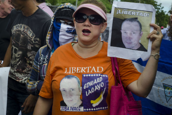 La madre del preso político Edward Lacayo, Estela Rodríguez, con una pancarta pidiendo la libertad de su hijo meses atrás. Crédito: Manuel Esquivel.