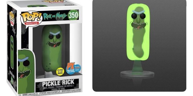 La versión SDCC del Pickle Rick sin extremidades es una versión que brilla en la oscuridad de una figura Pop exclusiva de PX anterior, lo que indica que los experimentos de decapado de Funko Pop Rick resultaron en una alta dosis de radiación en un universo alternativo.