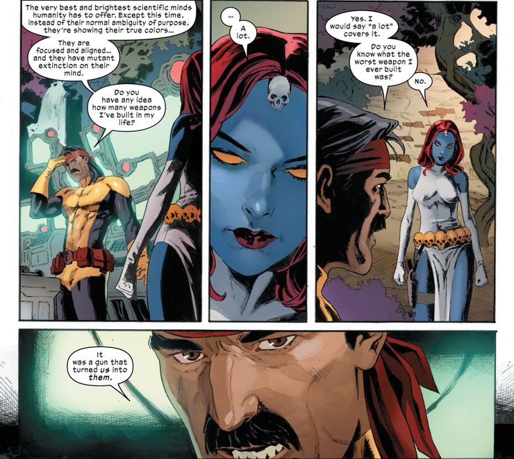 Mientras Forge y Mystique están hablando, Forge comparte una especie de oscura admiración por los científicos humanos de Orchis. Aparentemente, él ve su dedicación y único propósito de acabar con la raza mutante casi refrescante dado su disgusto por las armas engañosas hechas con afirmaciones iniciales de que fueron construidas para algo más positivo más allá de su verdadero propósito como máquinas de matar. Esto es lo que lo motiva a revelar la peor arma que jamás haya fabricado: su neutralizador mutante.