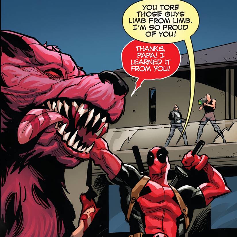 Mientras Harrower intentaba resucitar una nueva versión de Carnage que fuera leal solo a ella (y no al Rey de Negro), subestimó en gran medida la influencia de Deadpool en el simbionte. No solo usó el factor de curación de Wade para convertirse en una forma de vida nueva e independiente, sino que también incorporó aspectos del propio Deadpool, haciendo que el simbionte fuera ferozmente leal a su “padre”. Y lo que hizo que la lealtad del simbionte hacia Deadpool fuera aún más fuerte fue la aceptación inmediata y completa de Deadpool hacia ella. Deadpool no veía al simbionte como un horrible parásito alienígena, sino que la veía como su hija legítima.