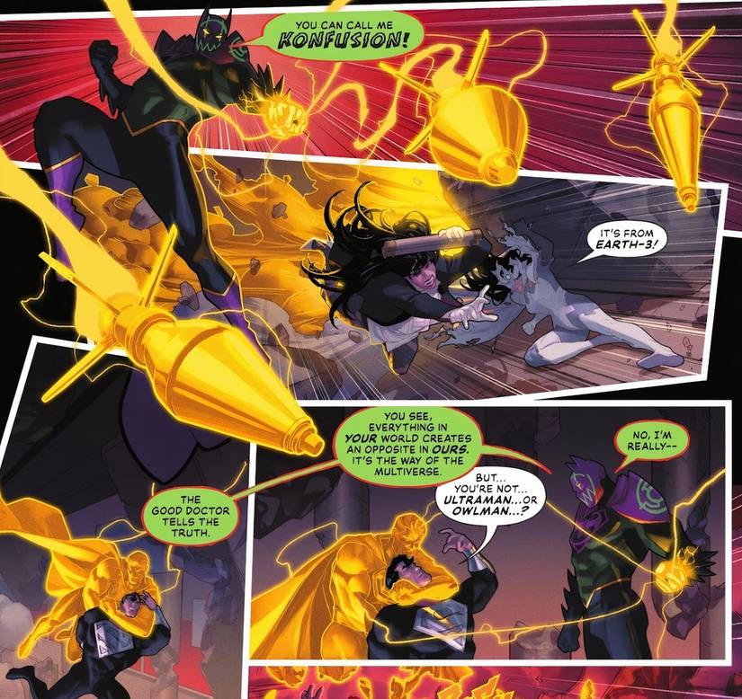 El diseño de Konfusion hace eco de esta estructura pero introduce un símbolo de cofre diferente y una combinación de colores vibrantes de púrpura, verde, negro y dorado, complementados con graffitis de color verde neón que cubren su máscara y su traje. Mientras ha confirmado que no es Owlman ni Ultraman, las contrapartes de Batman y Superman en Tierra-3.—Su verdadera identidad sigue siendo un misterio. Su combinación de colores se parece mucho a la del Joker; sin embargo, la versión Tierra-3, conocida como The Jokester, representa el bien más que el mal. Esto plantea preguntas intrigantes sobre la naturaleza de este nuevo villano, aumentando la anticipación por la revelación de la verdadera identidad de Konfusion.