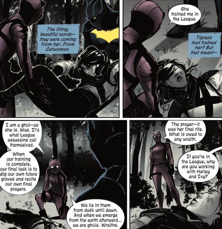 Por lo general, Catwoman es conocida por sus robos y su capacidad para sacar lo mejor de Batman. También ha sido una heroína reformada en ocasiones, ayudando a limpiar las calles de Gotham junto con Bat-Family. Esta novela gráfica aprovecha brevemente esa reforma, aunque se centra predominantemente en la vida personal de Selina en lugar de la ciudad en su conjunto. Esto permite centrarse más en su nuevo origen con la Liga de Asesinos. Fusionar las habilidades de los dos principales intereses amorosos de Batman, Selina y Talia al Ghul, es un movimiento audaz que vale la pena, haciendo Gatúbela mucho más letal que antes.