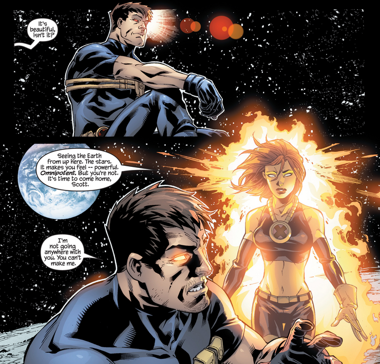 Mientras los dos equipos de X-Men intentan reconciliarse entre sí, Jean se encuentra con su novio en la luna, sus poderes le permiten viajar y sobrevivir en el espacio. Después de acusar a Jean de estar celoso de su poder, las nuevas habilidades de Cyclops comienzan a desvanecerse a mitad de la batalla, lo que hace que Jean pregunte si vale la pena morir por el control. Aunque Scott Summers finalmente cede a la razón, todo el incidente demostró que una vez que la energía solar detrás de sus explosiones ópticas se canalizó por todo su cuerpo, Cíclope podría convertirse en un mutante divino, con Ultimate X-Men confirmando que el potencial secreto de sus poderes estaba más allá de lo que los fanáticos sospechaban.