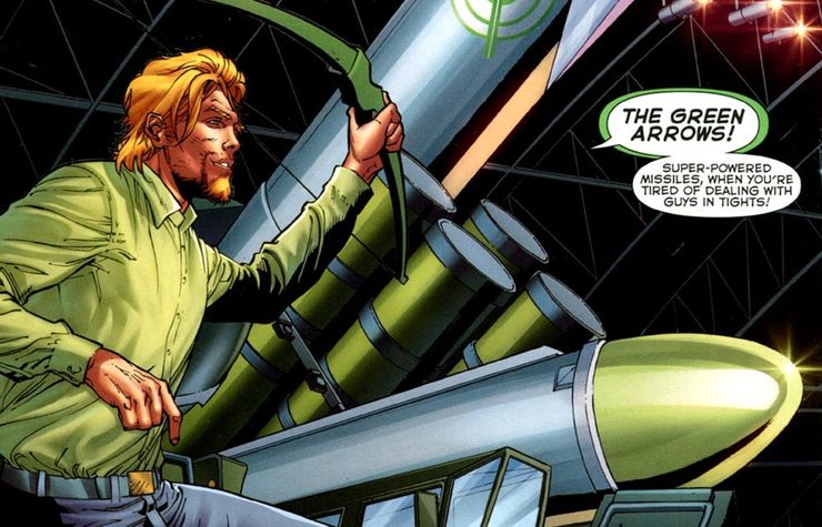 En esta línea de tiempo alternativa, Oliver Queen tiene más en común con un Tony Stark temprano, creyendo que sus armas están ayudando a hacer del mundo un lugar más seguro, pero también disfrutando de las riquezas y el reconocimiento que se obtienen como resultado. Ante un grupo de inversores militares intrigados, Oliver Queen explica que su investigación ha indicado que necesitan aumentar sus capacidades armamentísticas para combatir las crecientes amenazas a la Punto de inflamabilidad mundo. Les presenta su último producto, Green Arrows; misiles superpoderosos avanzados que los militares podrían usar cuando quieren destruir a los superhumanos.