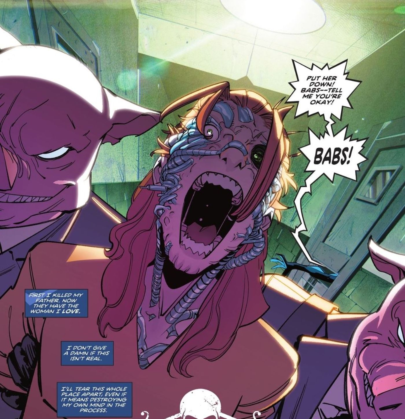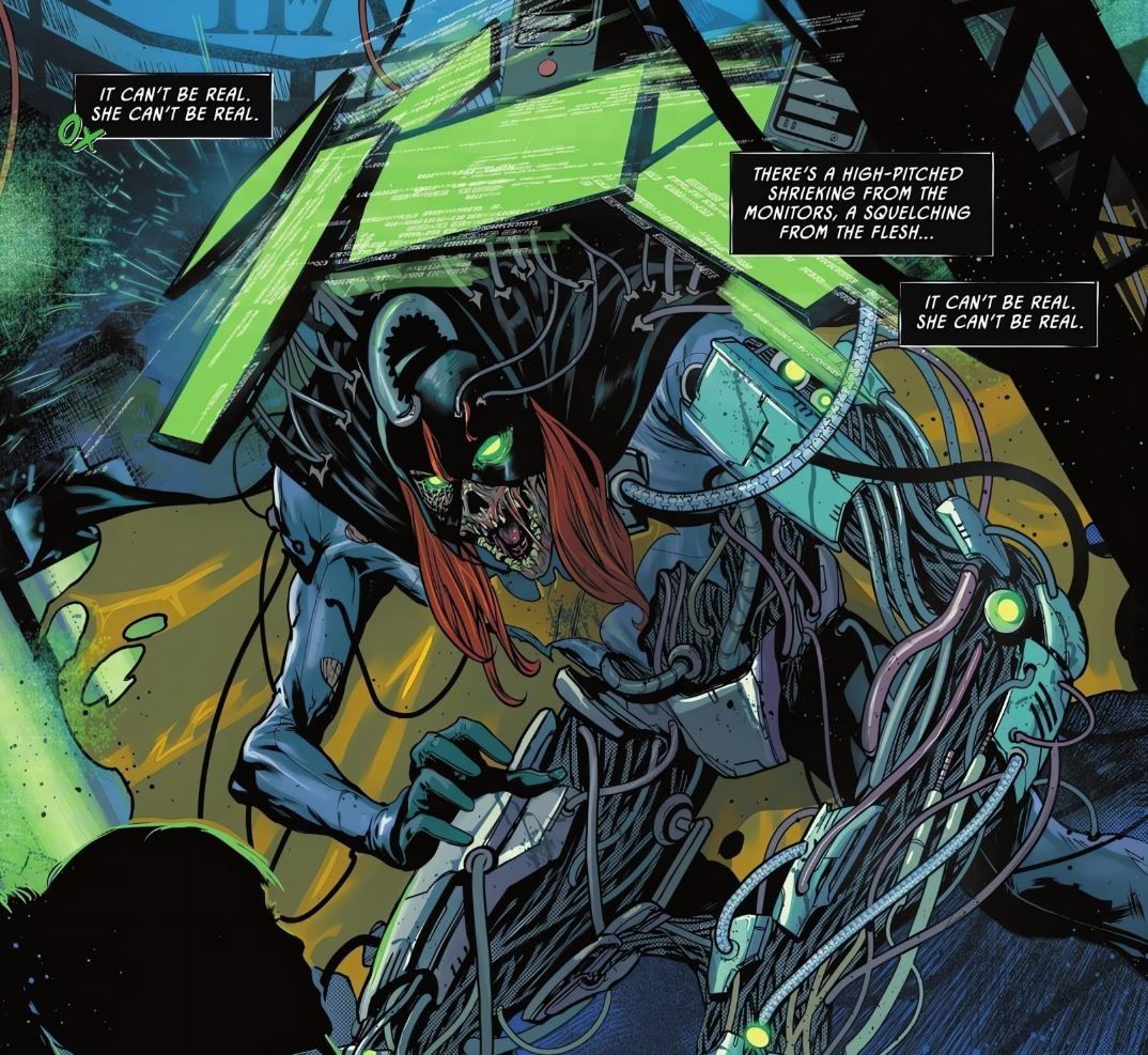 Mientras tanto, Dick Grayson está teniendo un sueño horrible similar sobre Barbara en Caballeros del Terror: Nightwing #1 por Becky Cloonan, Michael Conrad y Daniele Di Nicuolo. Nightwing ha despertado atrapado en Arkham Asylum. Mientras Nightwing intenta tener una idea de las cosas con Scarecrow, ve a Barbara siendo escoltada por el pasillo. Solo que en lugar de la mujer que ama, Dick ve que Barbara se ha convertido en una inquietante amalgama tecnoorgánica.