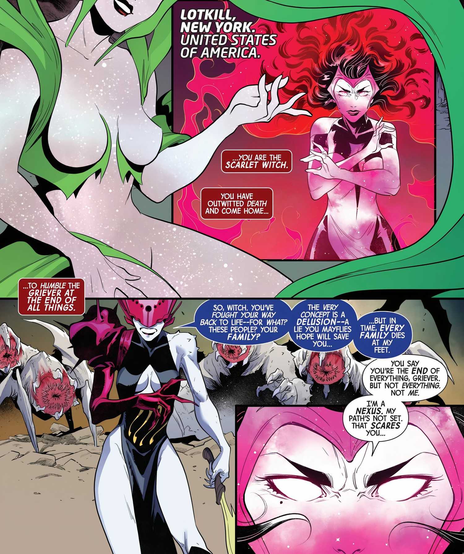 Scarlet Witch ha emprendido un viaje increíblemente turbulento con sus propios poderes. Ella ha sido marcada como un peligro para el mundo, perdió el control y luchó duro para recuperarlo. Significó una larga búsqueda de autodescubrimiento y de profundizar en la brujería y en su propia psique. Si el Griever hubiera puesto su mirada en el mundo en un momento anterior, es posible que hubiera logrado su objetivo y extinguido por fin la existencia. En cambio, se enfrentó al Nexus estando en paz consigo misma y, por tanto, más fuerte que nunca. El doliente al final de todas las cosas No puede destruir a la Bruja Escarlata ni al universo bajo su protección.