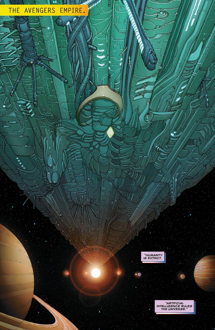Vengadores IA El número 11, escrito por Sam Humphries y dibujado por Andre Lima Araujo, muestra un futuro lejano, gobernado por el Imperio de los Vengadores. La sede del Imperio se encuentra en una enorme nave del tamaño de un sistema solar. Se revela que esta enorme nave espacial es en realidad la Visión, y esta es su forma definitiva.