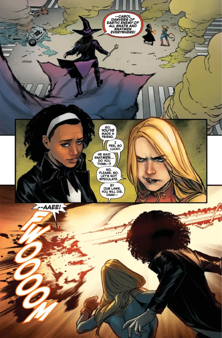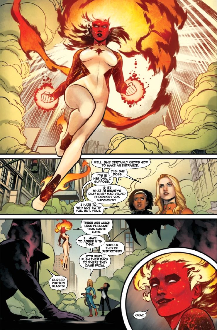 En historias recientes, el conquistador alienígena Vox Supreme persiguió a todos los héroes y heroínas que alguna vez llevaron el nombre de Capitán Marvel, para convertirlos en armas. La batalla final de Marvels contra Vox Supreme tuvo lugar en New Hala, donde Carol, inspirándose en el uso de sus habilidades por parte de Monica Rambeau, enfocó sus poderes y manifestó un ser de energía sensible que tiene un extraño parecido con su forma binaria. Sin embargo, después de ganar la batalla, este ser no desapareció, ya que absorbió rastros de ADN y energía residual en la atmósfera del planeta, estabilizándose. una vista previa para capitana maravilla El número 37 (de Kelly Thompson, Julius Ohta y Ruth Raymond), compartido por Marvel Comics, sugiere el verdadero alcance de este cóctel único.
