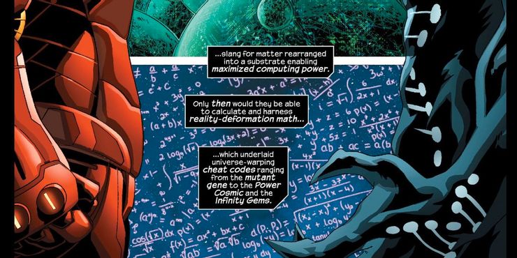 La idea de que las Gemas del Infinito sean simplemente datos y matemáticas es extraña, pero tiene mucho sentido. Tal como están ahora, los Stones son solo información codificada para actuar y responder de cierta manera, y cada uno tiene una tremenda cantidad de poder computacional. Esta es la misma idea para Power Cosmic y el gen X mutante mencionado anteriormente también; estos solo tienen diferentes cantidades de poder computacional y están codificados para actuar de ciertas maneras. Iron Man y ASI quieren convertir todo en una cadena de datos simple pero compleja para poder reformarla como mejor les parezca.