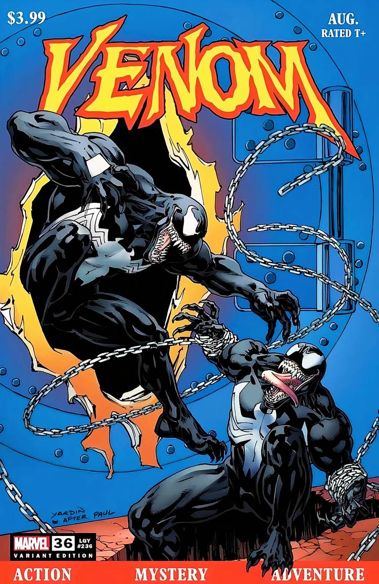 • A medida que el conflicto se intensifica, el enfrentamiento entre Eddie y Dylan por el simbionte Venom traerá conflictos infinitos a todas las realidades, en un arco que cambiará el mito de los simbiontes de Marvel.