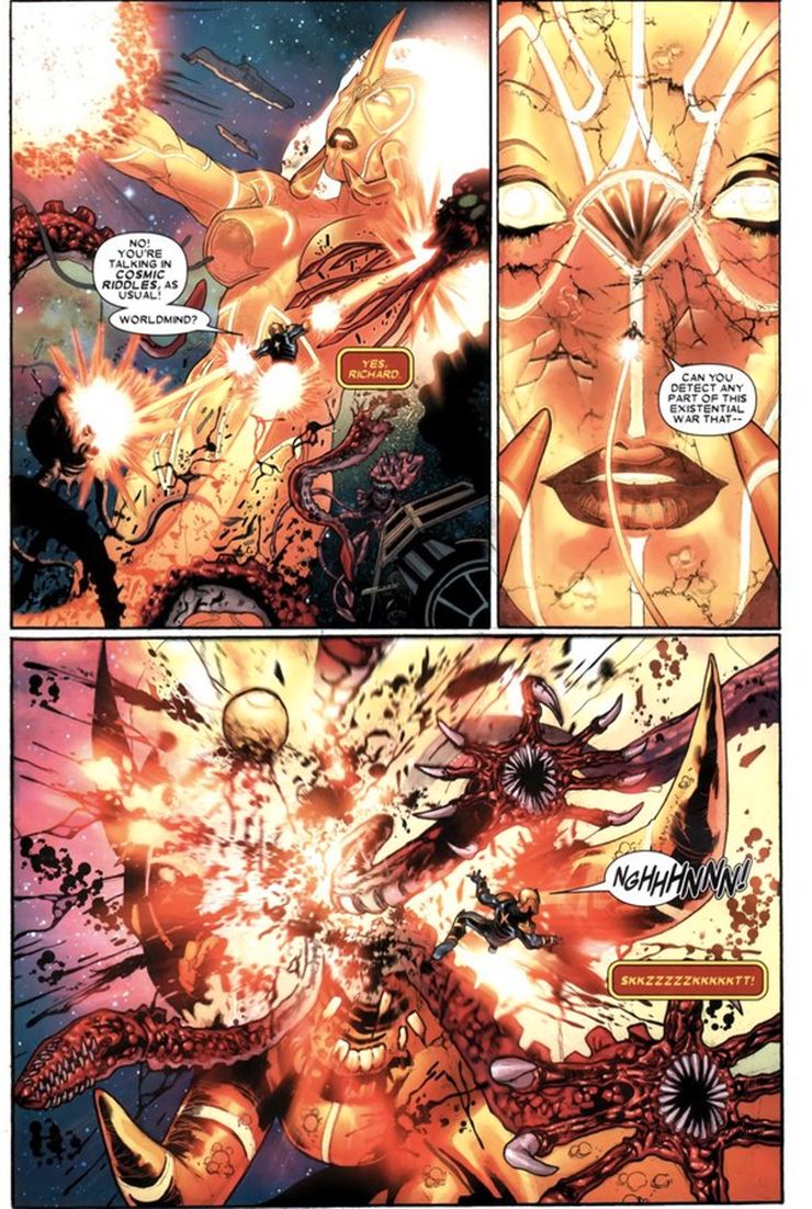 Inicialmente, las fuerzas del Cancerverso, como los retorcidos Vengadores, fueron mantenidas a raya por el poder reunido de los héroes cósmicos, como Nova y Quasar, reforzados por la llegada de varios seres cósmicos superiores, incluido Galactus, sus antiguos rivales Aegis y Tenebrous. , y una hueste de Celestiales. Sin embargo, el líder de Cancerverse, Lord Mar-Vell, desplegó su arma más poderosa, el Galactus Engine, el arma definitiva creada por Many-Angle-Ones mediante la reingeniería y la infusión de energías sobrenaturales en el cuerpo imperecedero del Galactus de Cancerverse. El motor de Galactus era tan grande que empequeñecía a los seres cósmicos, que no pudieron contenerlo por mucho tiempo. El primero en caer es Aegis, seguido por Arishem el Juez y otros tres Celestiales. Sin embargo, la forma en que Engine mata a estas entidades es lo que hace que esa abominación sea realmente aterradora.