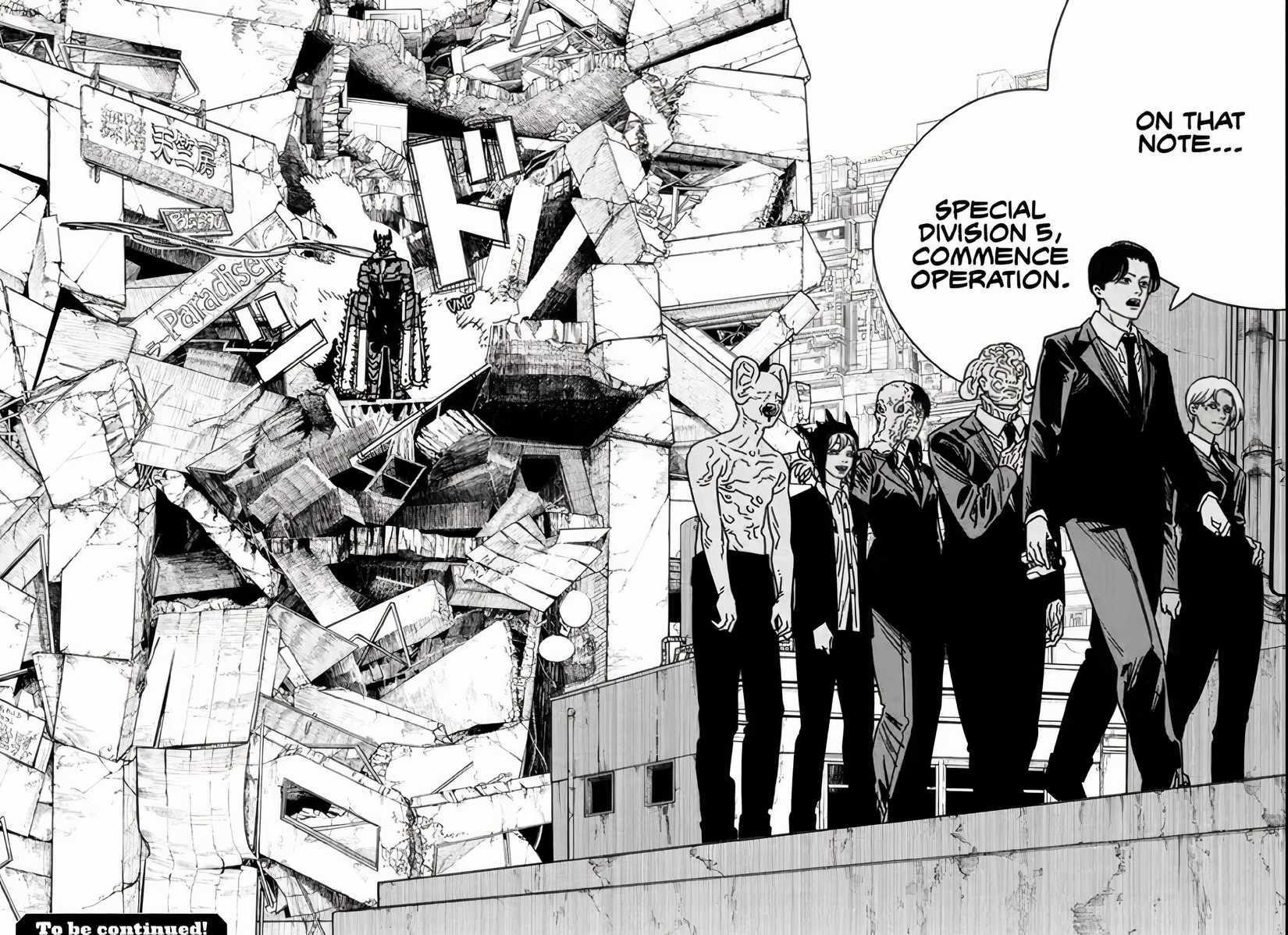 La reaparición del Héroe del Infierno no fue lo único interesante de este capítulo. Después de confirmar la ubicación de Chainsaw Man, Seguridad Pública se estaba preparando para irrumpir y enfrentarse a él. Una nueva división conocida como División Especial 5compuesto por nuevos híbridos y un líder humano, se estaba preparando para la batalla. Curiosamente, el objetivo principal no es matarlo ni capturarlo, sino no permitirle escapar y dañarlo de cualquier forma posible. Desafortunadamente para ellos, Chainsaw Man ya se adelantó al grupo y está a punto de producirse una masacre.