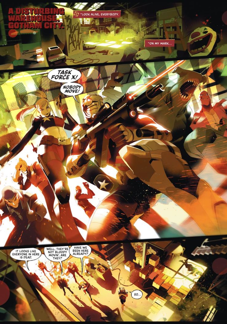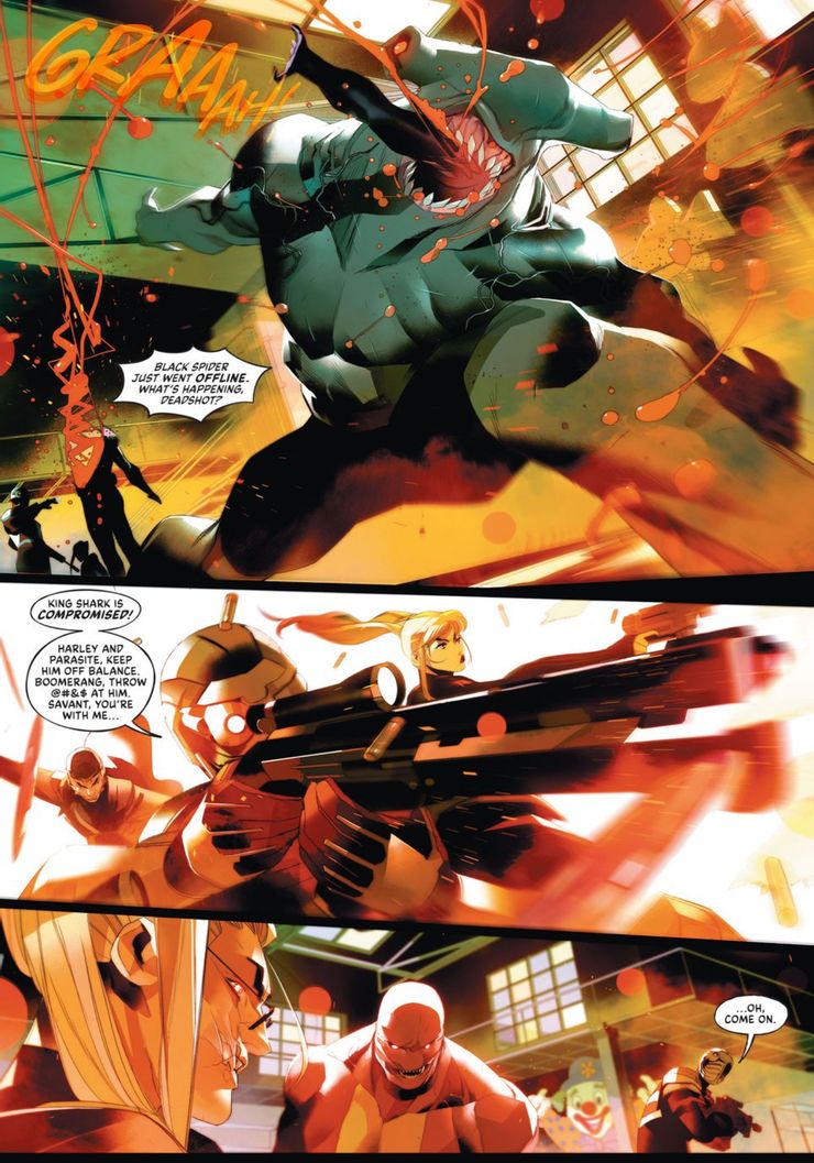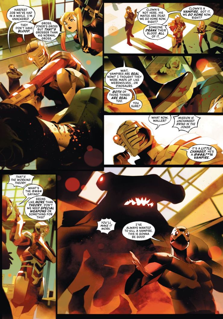 De vuelta con Task Force X, Harley dice que los cadáveres en el almacén son mucho más asquerosos que el trabajo habitual del Joker, y Deadshot señala que alguien bebió toda su sangre. Mientras descubren cómo proceder a continuación, el vampiro King Shark se come vivo a Black Spider, demasiado emocionado. Sin embargo, rápidamente aprenden que hay más vampiros entre ellos de lo que inicialmente se creía. Amanda Waller podría haber enviado al grupo a su misión más letal, ya que el Escuadrón Suicida podría no sobrevivir a la batalla.