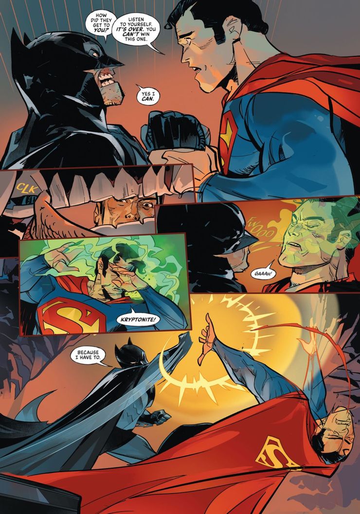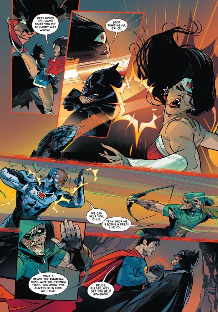 Dos ataques de vampiros se revelan en una nueva vista previa de DC contra vampiros #5 por James Tynion IV, Matthew Rosenberg, Simone Di Meo y Otto Schmidt. El primero presenta a Task Force X asaltando un almacén, solo para encontrar cuerpos ensangrentados y fríos. Mientras tanto, Batman y Green Arrow están incluidos entre los héroes que se enfrentan a sus antiguos aliados. Batman golpea a Superman con una explosión de kryptonita almacenada en una de las cavidades de sus dientes después de que el Hombre de Acero le dice que no tienen forma de ganar.