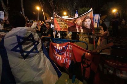 Manifestantes derechistas en una protesta contra la incorporación de Naftali Bennett y Ayelet Shaked al gobierno alternativo, el 30 de mayo en Tel Aviv.Sebastian Scheiner / AP
