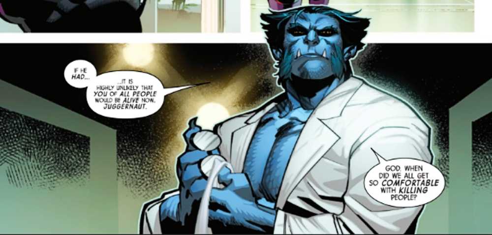 “¿Cuándo nos sentimos tan cómodos con matar gente?“Beast pregunta, y es importante tener en cuenta que no aboga por la fuerza 100% no letal en todo momento, sino que lamenta que los X-Men se hayan endurecido demasiado, demasiado rápido para llevar la vida en busca de su visión de” bien “.