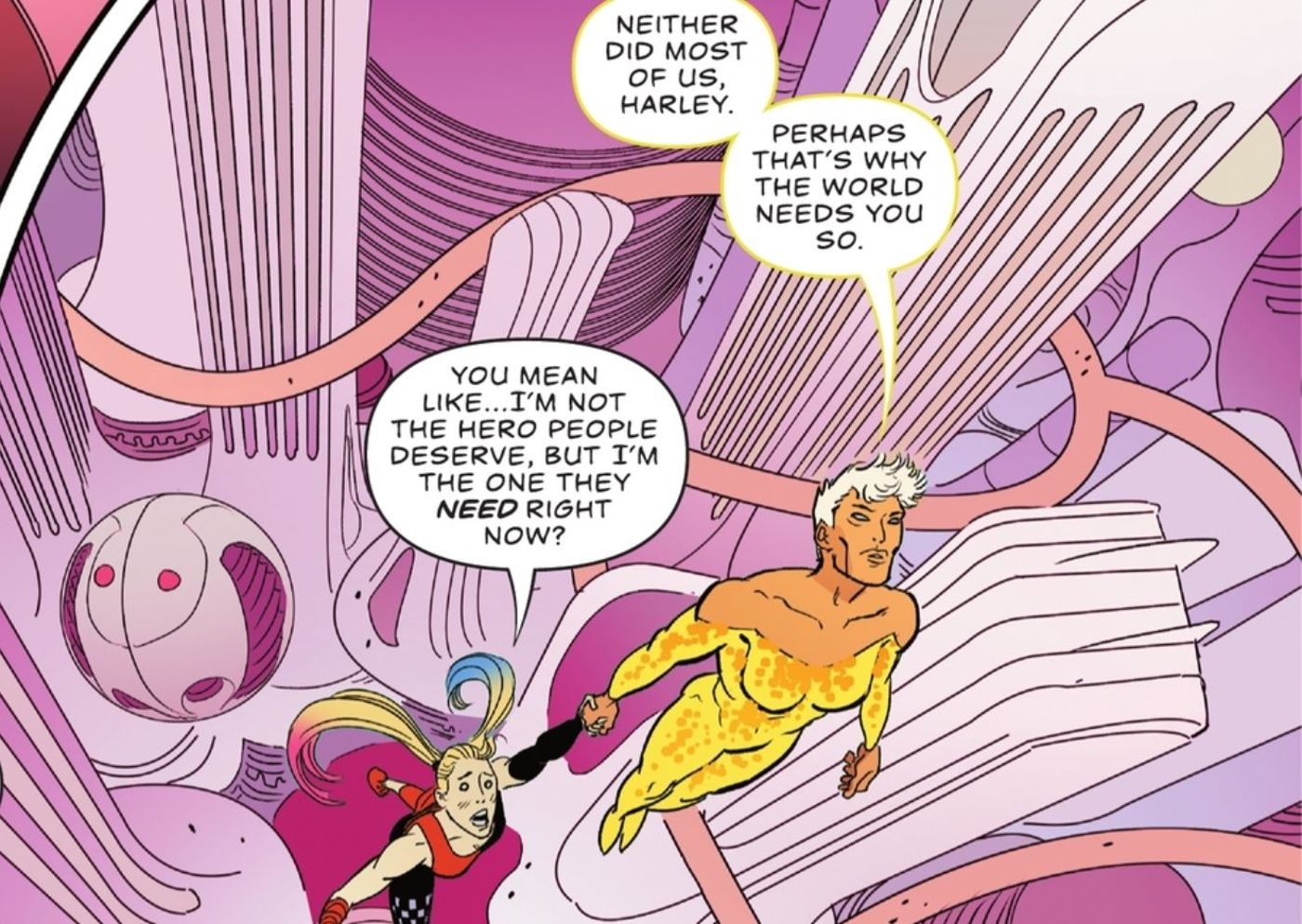 “/> Lady Quark le dice a Harley Quinn que su alma es una de las más fuertes del multiverso y que incluso si el mundo no la quiere, Harley es necesaria para detener las calamidades actuales en el multiverso. Harley compara su estado con ser el héroe que el mundo necesita, pero no el que se merece. Quark pregunta si a Harley se le ocurrió esa hermosa declaración, y Harley responde tímidamente que sí.