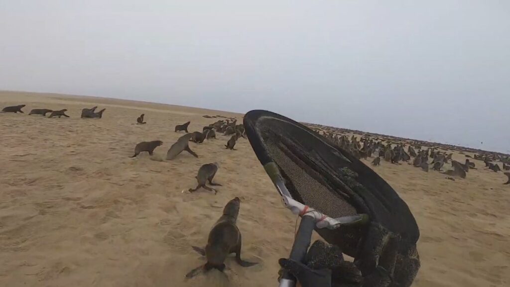 Decenas de lobos marinos salen corriendo como locos hacia el mar. Escapan de Naude Dreyer, conservacionista y fundador de la ONG Ocean Conservation Namibia, que les persigue a toda velocidad con una red parecida a un gran cazamariposas intentando atrapar a uno de los ejemplares para liberarlo del hilo de plástico que le rodea el cuello. Pero los lobos marinos no conocen sus buenas intenciones y luchan por no ser capturados. Finalmente, Dreyer lo consigue, atrapa a una de las crías por la cola, la arrastra fuera del agua y la inmoviliza para cortar el cable enredado alrededor de su cuello. Esta particular caza, que podría parecer que va contra el animal en caso de no continuar viendo la grabación, acaba felizmente con el ejemplar regresando al mar sin el cable que se le estaba clavando en la piel.