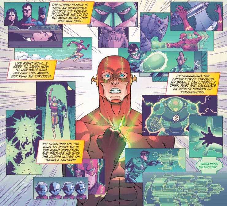 Pero Barry Allen fue capaz de mostrar cómo el anillo de un Linterna Verde podría tener un buen uso en El flash anual # 2 por Brian Buccellato y Sami Basri. Green Lantern y Flash se ven transportados a un campo de batalla alienígena llamado “Arena World”, donde se ven obligados a competir en una lucha a muerte. A pesar de enfrentarse a algunos guerreros poderosos, Green Lantern y Flash luchan valientemente y llegan a la última ronda del torneo. Sin embargo, solo uno de ellos puede enfrentarse al campeón de Arena World. Green Lantern se vuelve inútil, pero le da a Flash una oportunidad de pelear al darle su anillo. Con poco tiempo para actuar, Flash canaliza Speed Force en su cerebro y recorre una infinidad de escenarios con el anillo. El anillo apunta a una debilidad, lo que le permite a Barry construir brevemente un bláster para dispararle a su oponente en la entrepierna.