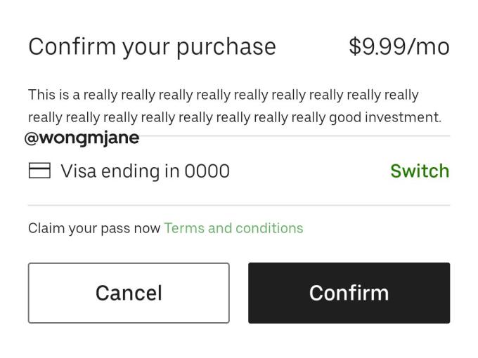 El Uber Eats Pass fue visto por primera vez por Jane manchun wong, el notorio especialista en ingeniería inversa que se ha convertido en un tipster frecuente de TechCrunch. Se las arregló para generar capturas de pantalla del código de la aplicación de Android de Uber que revela un prototipo de la función. "Obtén entrega gratuita, cualquier restaurante, en cualquier momento", dice, que muestra la cantidad de dinero que puedes tener o que ya has ahorrado.