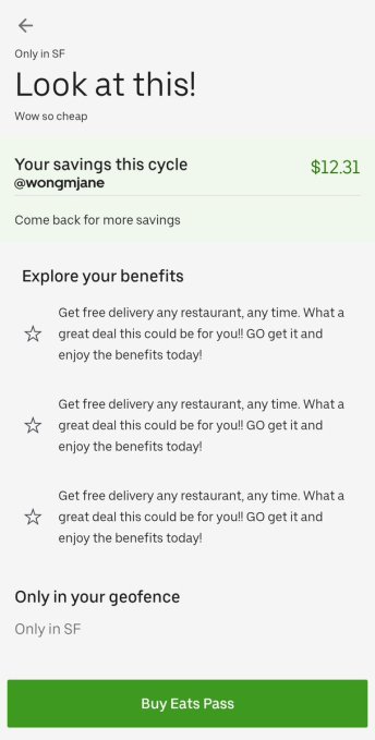El Uber Eats Pass fue visto por primera vez por Jane manchun wong, el notorio especialista en ingeniería inversa que se ha convertido en un tipster frecuente de TechCrunch. Se las arregló para generar capturas de pantalla del código de la aplicación de Android de Uber que revela un prototipo de la función. "Obtén entrega gratuita, cualquier restaurante, en cualquier momento", dice, que muestra la cantidad de dinero que puedes tener o que ya has ahorrado.