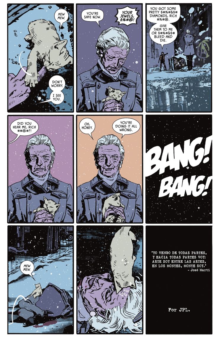La muerte de Catwoman al final de Batman/Gatúbela especial n.º 1 es un ejemplo perfecto de la falta de cambio sistémico que Bruce Wayne trajo a Ciudad Gótica. Después de que Bruce se fue hace mucho tiempo, Catwoman lo llora, pero finalmente acepta su muerte y continúa usando su fortuna para abrir un nuevo orfanato. Sin embargo, la tragedia no es ajena a la Bat-Familia, y mientras acaricia gatos en un callejón en Navidad, Selina Kyle es asesinada a tiros por sus perlas, una escena familiar para cualquier lector de Batman desde hace mucho tiempo.