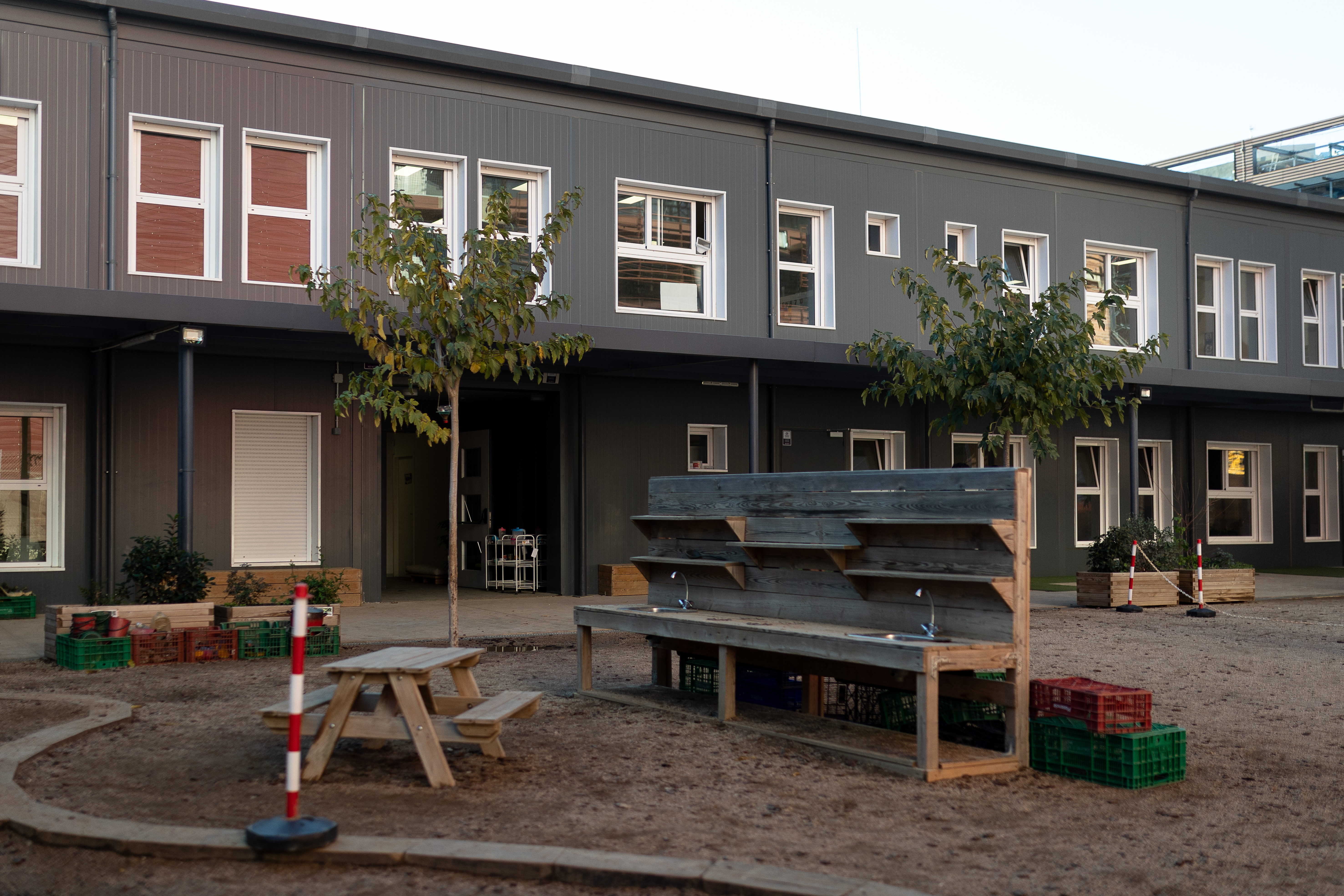 Uno de ellos es la escuela Auditori, en el Poblenou, que empezó en 2018 con P3 y ha ido creciendo a medida que los alumnos pasaban de curso: ahora tienen 200 niños, desde P3 hasta primero de Primaria. Este centro tenía que estar provisionalmente en módulos, pero su buen funcionamiento ha llevado a la decisión de dejarlo definitivamente. Su directora, Eva Martín, lamenta que se use el término “barracones” peyorativamente. “Para nosotros ha sido una oportunidad, porque con los arquitectos establecemos un diálogo entre el proyecto educativo y la construcción, nos permite ser muy flexibles en los espacios, y los adecuamos a los alumnos”, explica al lado de una ventana baja, que en una escuela de obra estaría a una altura de adulto. “Las familias al principio pueden tener dudas, sin embargo luego lo ven, y siempre tenemos lista de espera”, detalla. El centro tiene espacios como talleres de creación, de tecnología, y espacios sensoriales.