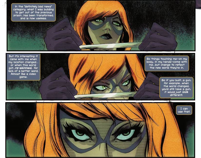 Mientras Barbara reflexiona sobre esta nueva regla de la dimensión en la que está atrapada, razona que si ella “Por ejemplo,” construyó un arma, entonces seguiría siendo un arma sin importar lo que suceda con la dimensión. nueva arma puede cambiar de apariencia, pero nunca cambia en funcionalidady si Babs continúa construyendo un arma real, su elección demostrará de una vez por todas que Batman nunca fue su jefe.