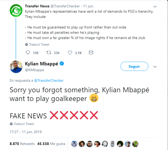 “Los representantes de Kylian Mbappé han enviado una lista de demandas a la directiva del PSG que incluyen: Tienen que garantizarle que jugará en el centro y no en la banda, tiene que chutar todos los penaltis cuando juegue y tiene que poseer un porcentaje mayor de los derechos de imagen si sigue en el club”, escribieron desde la cuenta @TransferChecker, algo que vio el propio Mbappé y no tardó en desmentir de forma irónica.