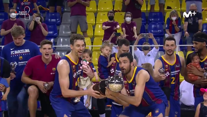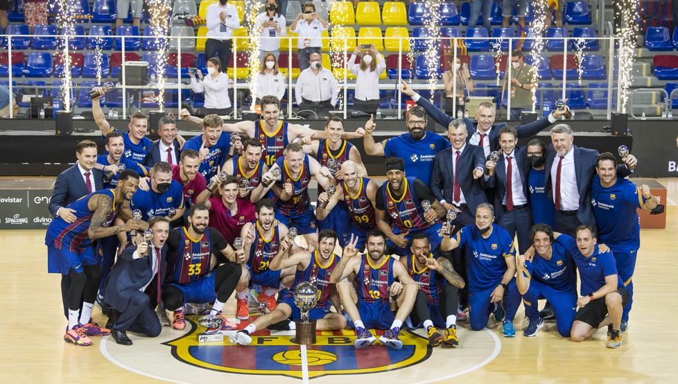 El presidente del Barça, Joan Laporta, se unió anoche a la celebración por el título liguero de la sección de baloncesto, confirmado con una contundente victoria por 92-73 sobre el Real Madrid en el Palau Blaugrana que puso el 2-0 definitivo en el Playoff Final de la Liga Endesa.