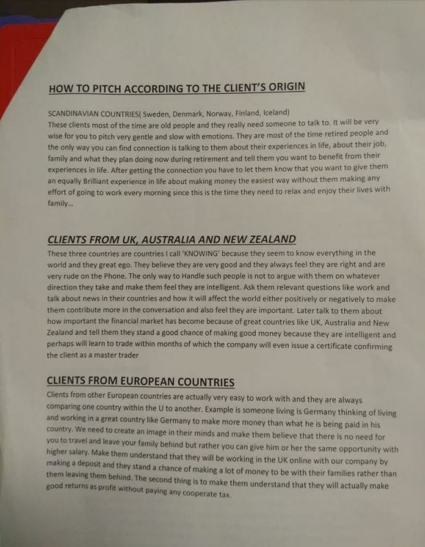 Notas de Milton Group sobre cómo dirigirse a los clientes, en función de su nacionalidad o de sus razones para no querer invertir.