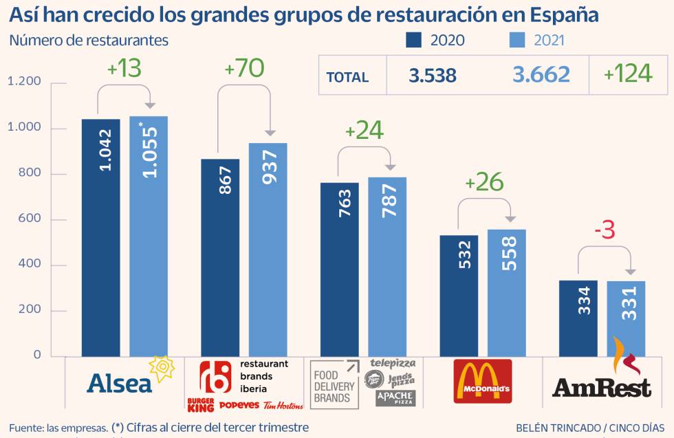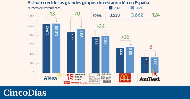Los cinco grupos de referencia que operan en la restauración organizada española han continuado apostando por las aperturas de nuevos establecimientos en 2021. Y lo han hecho pese a la crisis general que vive el negocio hostelero; a que algunas de estas empresas aún no han recuperado sus ingresos prepandemia; y pese a la pujanza del delivery.