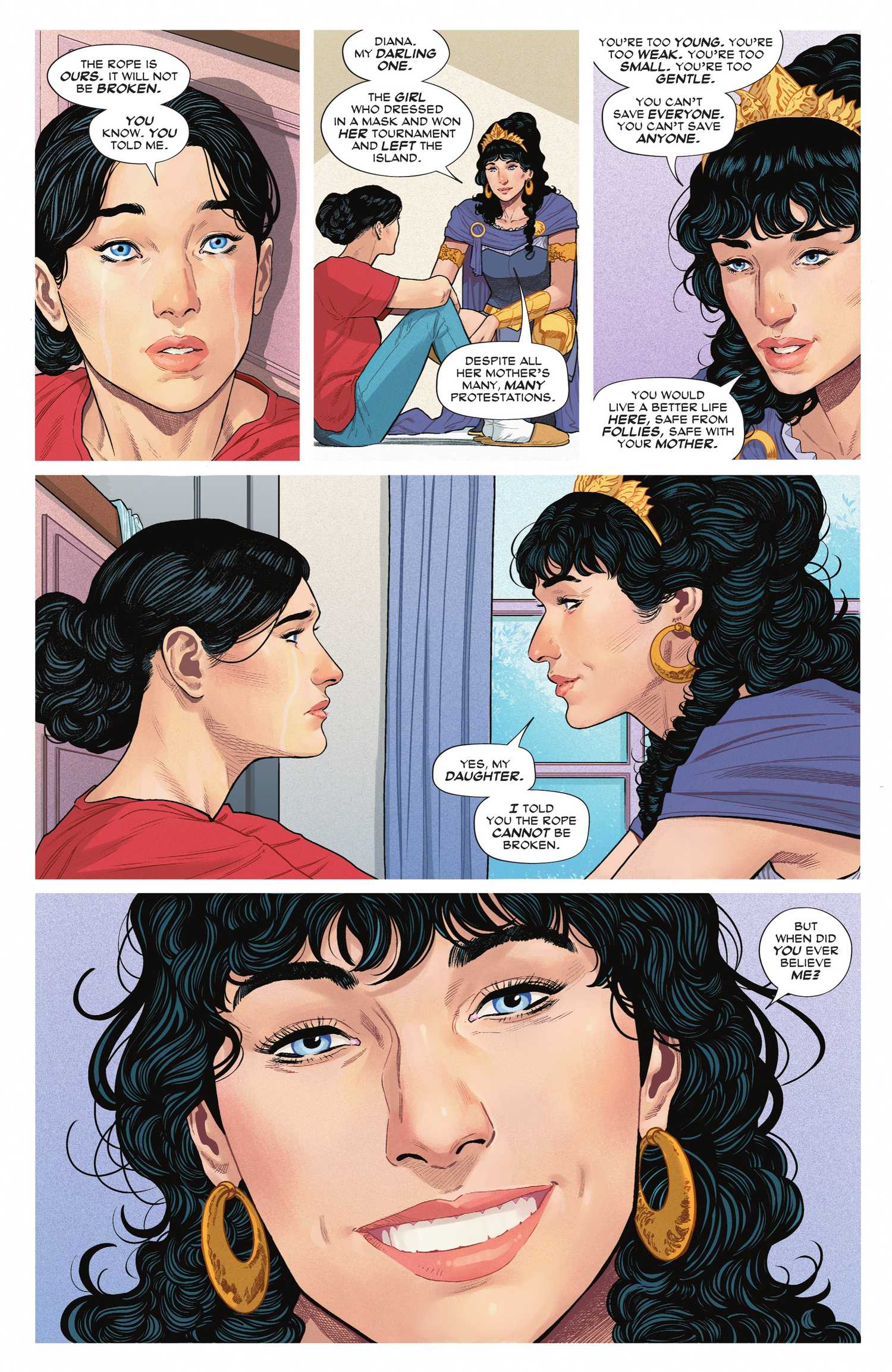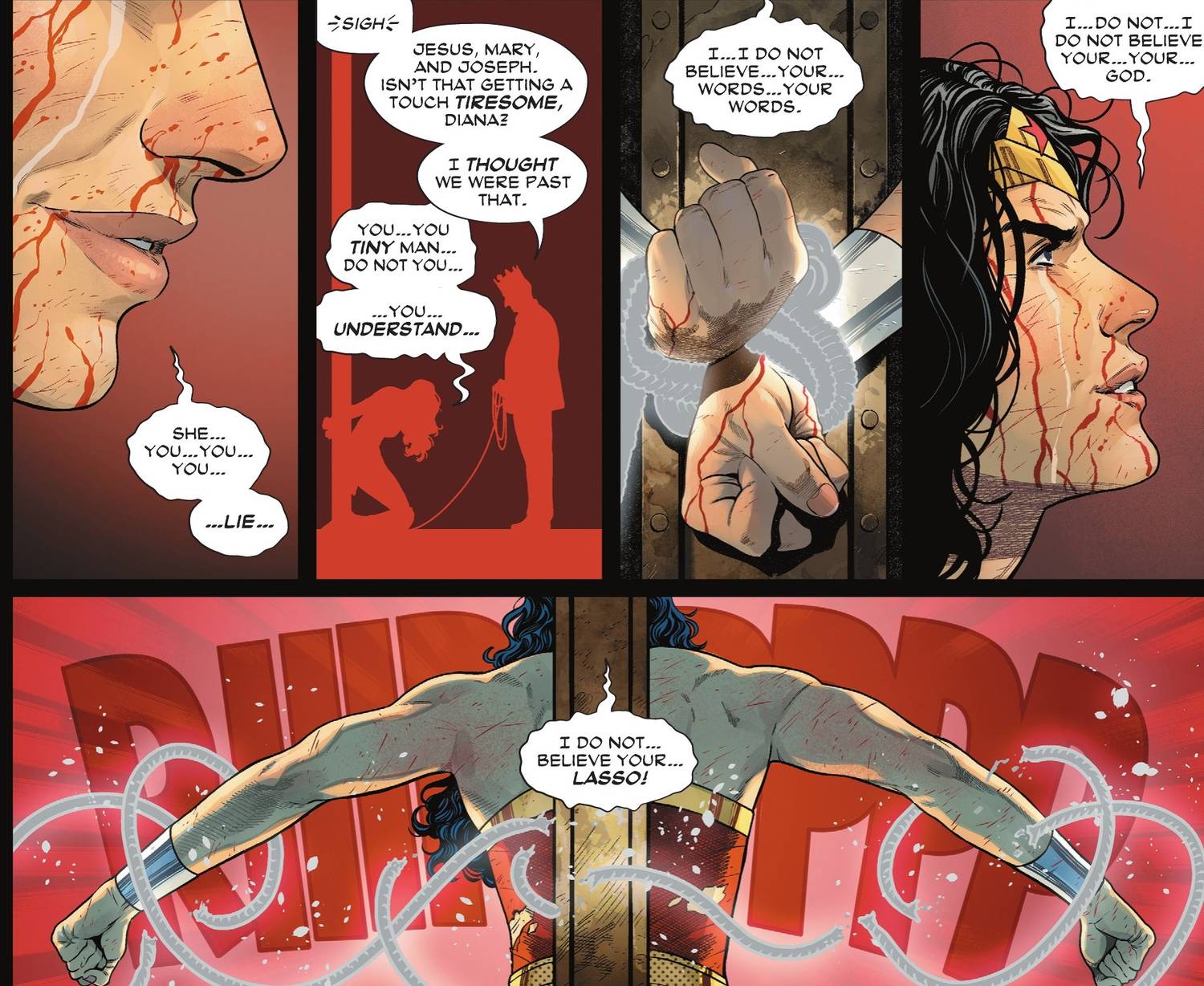 Sin embargo, el Soberano está usando el Lazo de las Mentiras contra Diana mientras intenta lavarle el cerebro para que se someta a él y crea que su lugar está debajo de un hombre. Sin embargo, al más puro estilo Wonder Woman, Diana rompe los lazos del Lazo de las Mentiras, una hazaña que debería ser imposible.