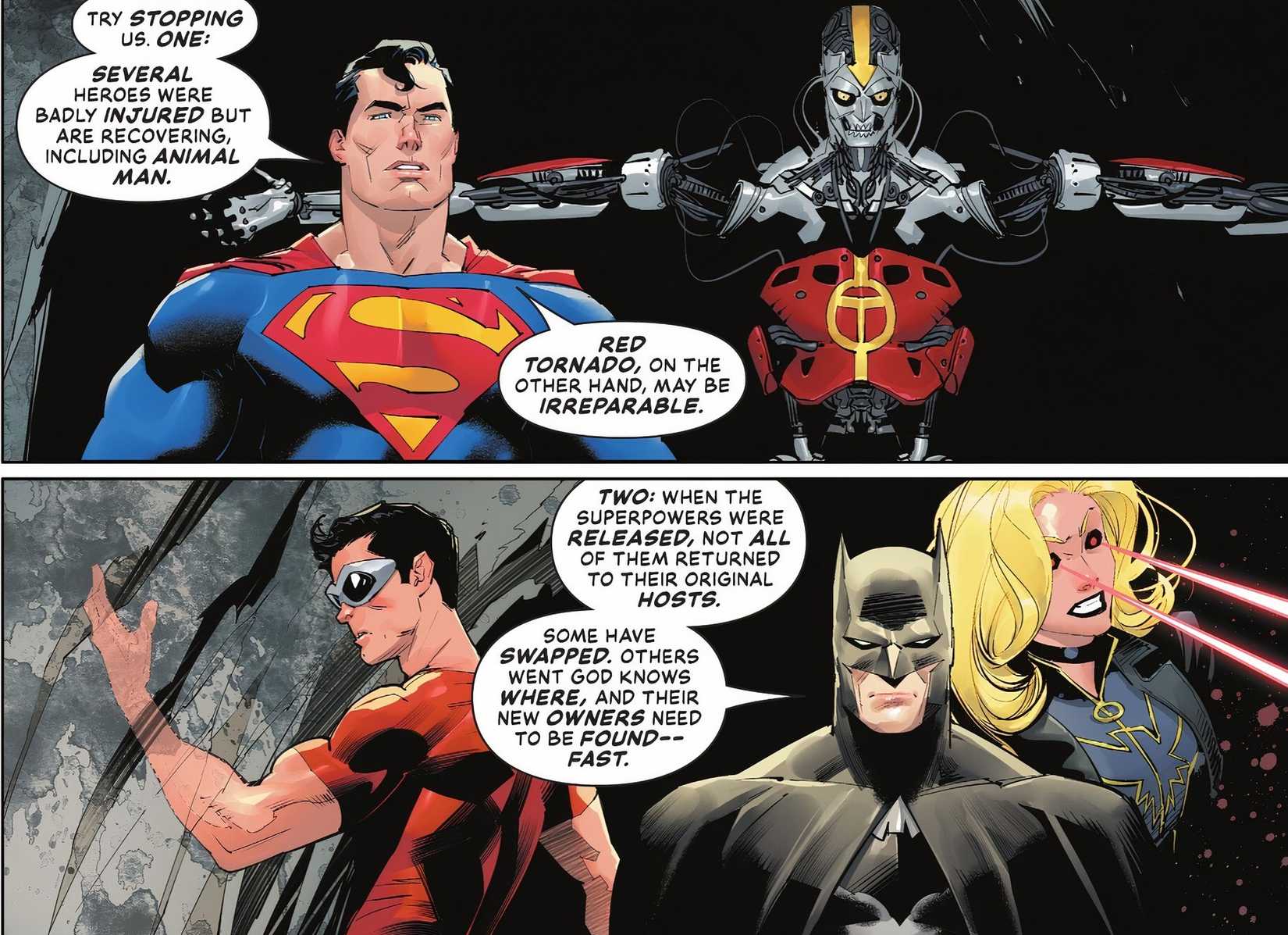 Por supuesto, al igual que la hija de Black Lightning, no todos los héroes se han beneficiado plenamente del cambio de poder. Flash de Barry Allen ha perdido sus poderes, de ahí que Wally esté dando un paso al frente para reemplazarlo, y no está claro si alguna vez podrá acceder a ellos nuevamente. Supergirl, por otro lado, se ha ganado un nuevo poder a cambio de uno antiguo. Ahora posee una capacidad de control mental que le permite borrar o alterar los recuerdos de los demás, aunque actualmente no puede usar su visión de calor. Similarmente, Thunder tiene un poder impresionante a su disposición, pero su incapacidad para contenerlo lo convierte en un beneficio y un inconveniente mortal.