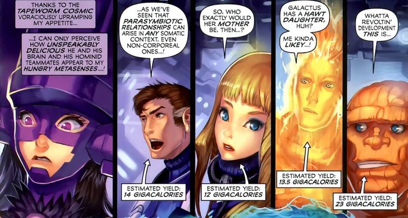 Galactus es uno de los villanos más peligrosos de Marvel y uno de los enemigos más antiguos de los Cuatro Fantásticos. Su hija es exactamente lo opuesto a Galactus. Ella no tiene tanta hambre de poder como él y, como tal, no tiene tanta hambre en general, restringiéndose a una dieta estricta. Cuando deja a Galactus “el equivalente en entrelazamiento cuántico de un mensaje de voz” Galacta reflexiona sobre los Cuatro Fantásticos cuando se acerca a ellos en busca de ayuda con respecto a una tenia cósmica dentro de ella. Mientras Reed Richards investiga y explica lo que le está sucediendo a Galacta, ella está completamente distraída por “la mente del homínido más brillante engendrado actualmente por la biomasa de este mundo”.