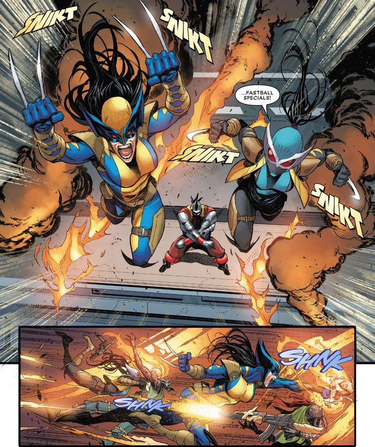 Ahora, una misión de rescate está en marcha en el nuevo Edad Oscura #4, ver a los héroes de Wakanda buscando salvar a aquellos a quienes Apocalipsis ha tomado cautivos. Sin embargo, mientras navegan hacia Europa en un helicóptero que ya no vuela, los héroes son atacados por los Ghost Riders del mar. Con todas las manos a la obra para repeler a los fieros piratas, Laura y Gabby entran en la refriega con un movimiento clásico de Wolverine junto a Colossus: el Fastball Special. Sin embargo, el dúo literalmente se duplica, haciendo que Colossus los arroje simultáneamente para repartir el doble de daño.
