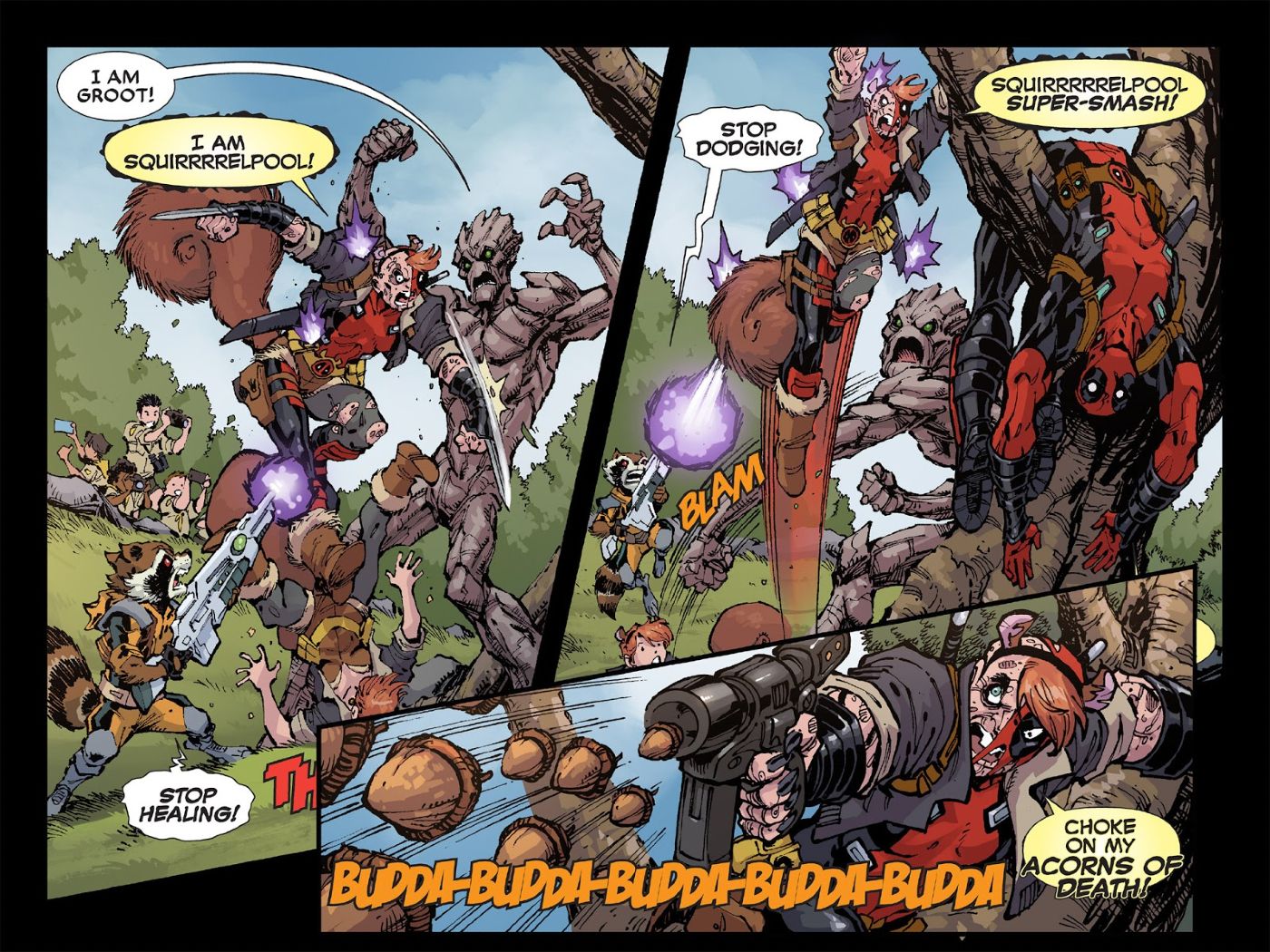 En Deadpool: ¿Demasiado pronto? por Joshua Corin, Todd Nauck, Reilly Brown y Jim Charalampidis Deadpool, y una variedad de otros personajes extravagantes de Marvel se encuentran en medio de un misterio de asesinato tras la muerte de Forbush Man. El propio Deadpool asume el papel de detective mientras intenta descubrir quién es el asesino antes de que ataquen de nuevo. Sin embargo, a medida que avanza el misterio, termina encontrándose cara a cara con su propia hija: Squirrelpool. Este personaje es un híbrido entre Deadpool y Squirrel Girl con el asesinato en mente, y en realidad logró heredar bastantes de las habilidades del Mercenario bocazas, incluida una de las películas que los fanáticos odian por completo.