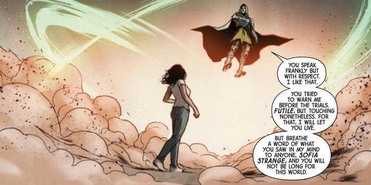 Cuando Doom llega a un pueblo desolado, de alguna manera mantenido con vida por magia, inmediatamente se dirige a un Sanctum Santorum de aspecto abandonado donde es recibido por Sofía. Sofia claramente está siendo controlada por la magia, pero Doom acepta sus solicitudes de una prueba mágica, y finalmente puede ingresar al Santorum. Si bien parece que Doom pensó que estaba a punto de conocer al Doctor Strange, resulta que la ciudad en realidad está siendo controlada por un Baron Mordo impulsado por Dark Dimension. Después de derrotar a Mordo, el Doctor Doom le pregunta a Sofía por qué fue a la aldea a la que ella responde. “Vine aquí en busca de mi padre. No se le ha visto en décadas …” Si el Sanctum Santorum no es suficiente para demostrar que Sofia es la hija de Strange, Doom la llama explícitamente “Sofia Strange”, confirmando su parentesco.