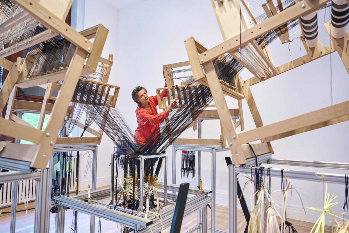 Lo que la diseñadora ama de verdad no es lo ya creado, sino lo que está por llegar. Por eso el telar multiaxial (Space Loom #2) colocado en uno de los seis espacios de la muestra es obra y herramienta central. A su alrededor, lanas desperdigadas por el suelo, ovillos de colores, papeles cortados, artilugios metálicos varios… Su día a día es ahora esta muestra, un work in progress donde siempre suceden cosas: se hilan nubes, se trenzan sogas, se descuelgan escaleras por las ventanas, se interactúa con los visitantes, a los que atiende un equipo mixto del Jongeriuslab y del Gropius Bau.