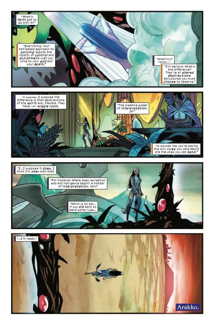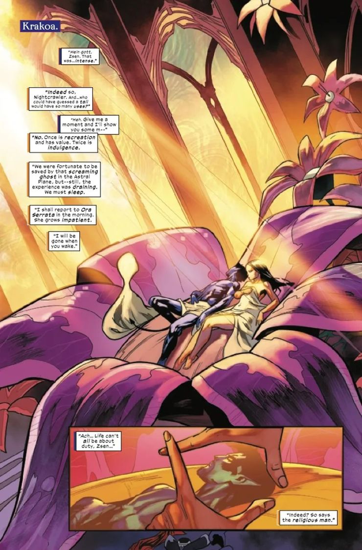 Desde el comienzo de Legión de X – escrito por Si Spurrier con arte de Jan Bazaldua y Frederico Blee – Nightcrawler se ha involucrado en un coqueteo físico y psíquico con el guerrero Arakki Weaponless Zsen, quien casi de inmediato deja en claro que se siente atraída por Kurt. en un adelanto de Legión de X # 4 su relación finalmente se consuma. Nightcrawler siempre ha sido sexual, incluso su cola prensil azota y se endurece de acuerdo a sus atracciones y deseos. Pero Zsen rápidamente señala su hipocresía, reflexionando sobre cómo su fuerza “policial”rechaza la rigidez del control y el castigo” y, sin embargo, todavía se aferra tan desesperadamente a su Dios ya su “Chispa”. Toda la escena, Kurt pidiéndole a Zsen que vuelva a acostarse con él y siendo rechazado rápidamente debido a su deber con Arakko, se basa en la hipocresía, ya que tiene lugar en The Bower, un santuario en Krakoa para la exploración sexual e íntima que Nightcrawler estaba horrorizado y disgustado cuando Stacy X lo mostró por primera vez en camino de x.