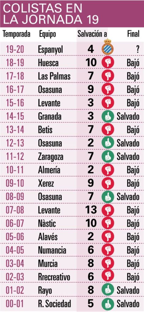 A una afición que se aferra a datos como que seis de los 19 equipos que desde la Liga 2000-01 concluyeron la primera vuelta como colistas acabaron logrando la salvación (Granada 2014-15, Osasuna 2012-13 y 2008-09, Zaragoza 2011-12, Rayo Vallecano 2001-02 y Real Sociedad 2000-01). O que sólo cinco de estos 19 equipos (Levante 2015-16, Granada 2014-15, Osasuna 2012-13, Almería 2010-11 y Alavés 2006-06) estuvieron más cerca de la permanencia, en cuanto a puntos, que el Espanyol 2019-20, que la tiene a cuatro puntos. O que cuatro equipos que la tenían más lejos acabaron asegurando su continuidad entre los ‘grandes’ del fútbol español (Zaragoza 2011-12, Osasuna 2008-09, Rayo 2001-02 y R. Sociedad 2000-01).