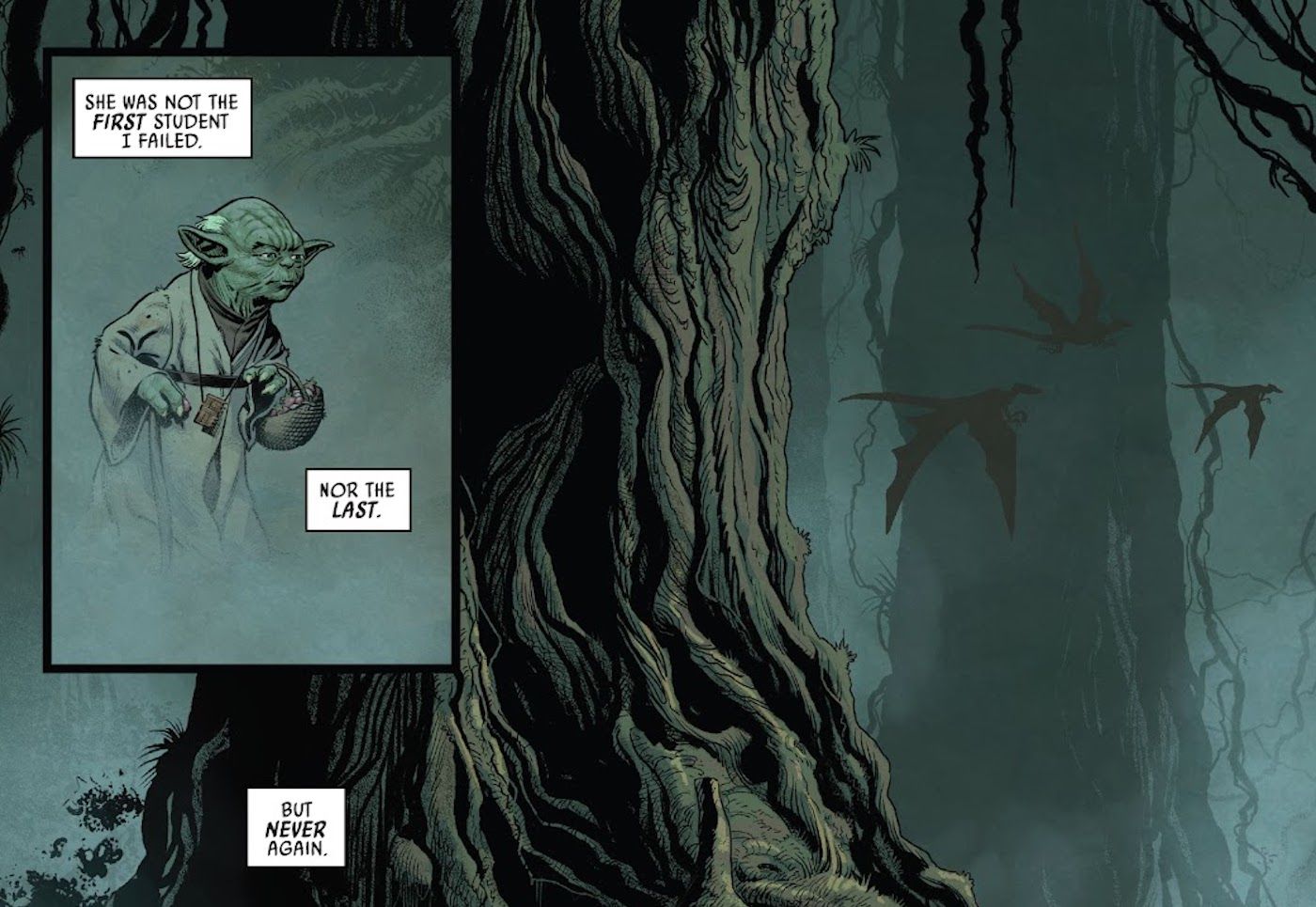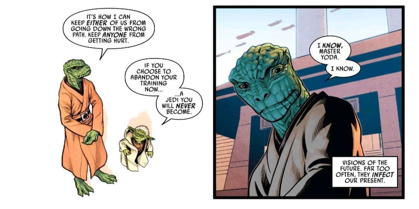 En Guerra de las Galaxias: Yoda #6 por Jody Houser y Luke Ross, el estudiante wookiee Krrsish tiene premoniciones de que su amigo, el trandoshano Gheyr, se vuelve hacia el lado oscuro. Estas premoniciones arruinan su amistad y, lo que es peor, Gheyr cree que son ciertas. Gheyr opta por terminar su entrenamiento y dejar la Orden Jedi para evitar que las visiones de su antiguo amigo se hagan realidad, algo que Yoda lamenta y vuelve a presenciar cuando Luke Skywalker deja Dagobah para salvar a sus amigos.
