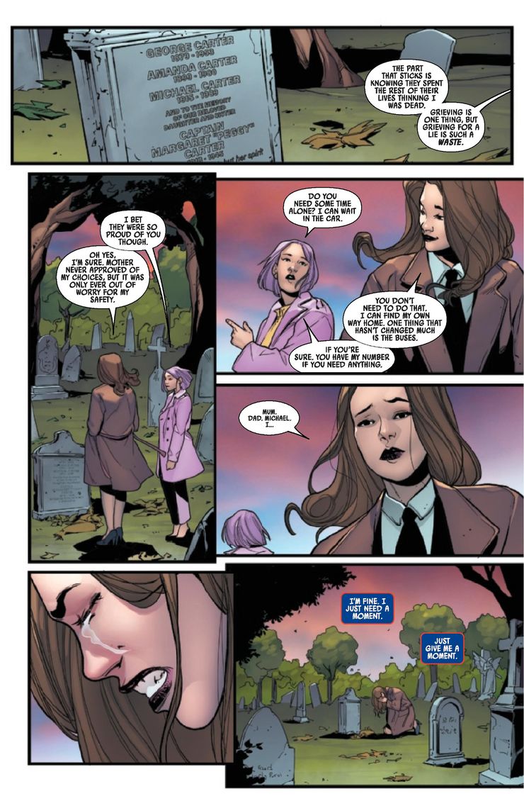 En capitán carter # 1 – por Jamie McKelvie, Marika Cresta y Erick Arciniega – Peggy regresa a su Londres natal e intenta encontrarle sentido a su nueva vida. Después de una sesión informativa con el primer ministro británico, se detiene en un cementerio para visitar la tumba de su familia. Los lectores se enteran de que su madre, su padre y su hermano obviamente están muertos, considerando que han pasado 80 años desde la desaparición de Peggy. Esto es muy diferente de la experiencia de Steve Rogers como Capitán América: perdió a sus padres antes de la guerra, no tenía hermanos y, después de ser descongelado, incluso pudo volver a conectarse con algunos de sus compañeros de guerra, como Nick Fury y “Dum Dum”. Dugan. Por otro lado, el dolor de la capitana Carter está perfectamente representado en la escena que la muestra rompiendo a llorar sobre la tumba de su familia. No solo sufre por haberse perdido la vida de su familia, sino que también se siente mal por ellos porque lloraron su pérdida cuando en realidad no estaba muerta.