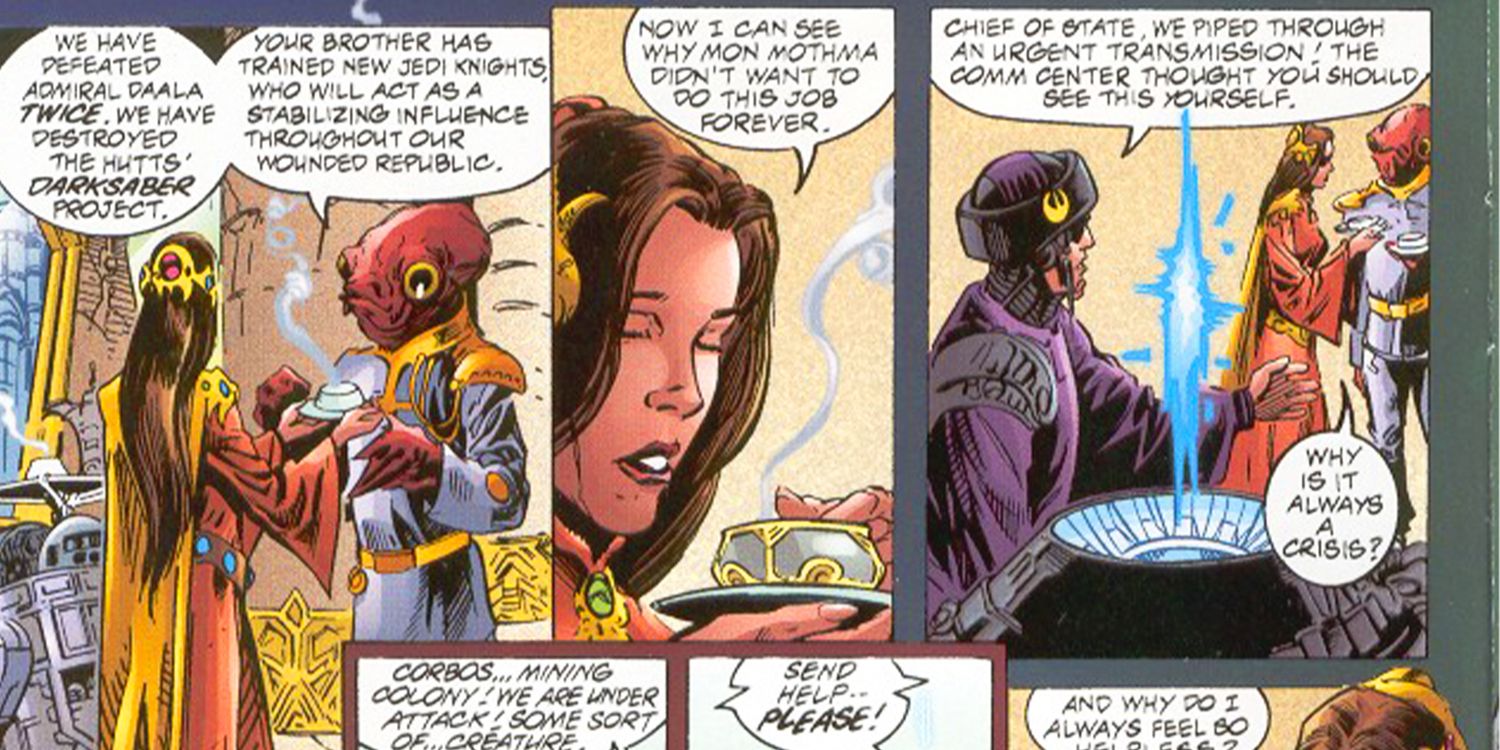 “/> Después de una misteriosa enfermedad que le había sucedido, Mon Mothma entregó notoriamente el cargo de Jefa de Estado a Leia, convirtiéndola en la jefa del gobierno de la Nueva República. Ocupó este cargo durante gran parte de la siguiente década, y una vez por otro mandato en la década siguiente, lo que equivale a más de 12 años como Jefa de Estado. Sin embargo, esto fue durante la primera infancia de sus tres hijos, por lo que a menudo estaban con cuidadores en Coruscant o escondidos en mundos santuario debido a sus ridículamente frecuentes secuestros.
