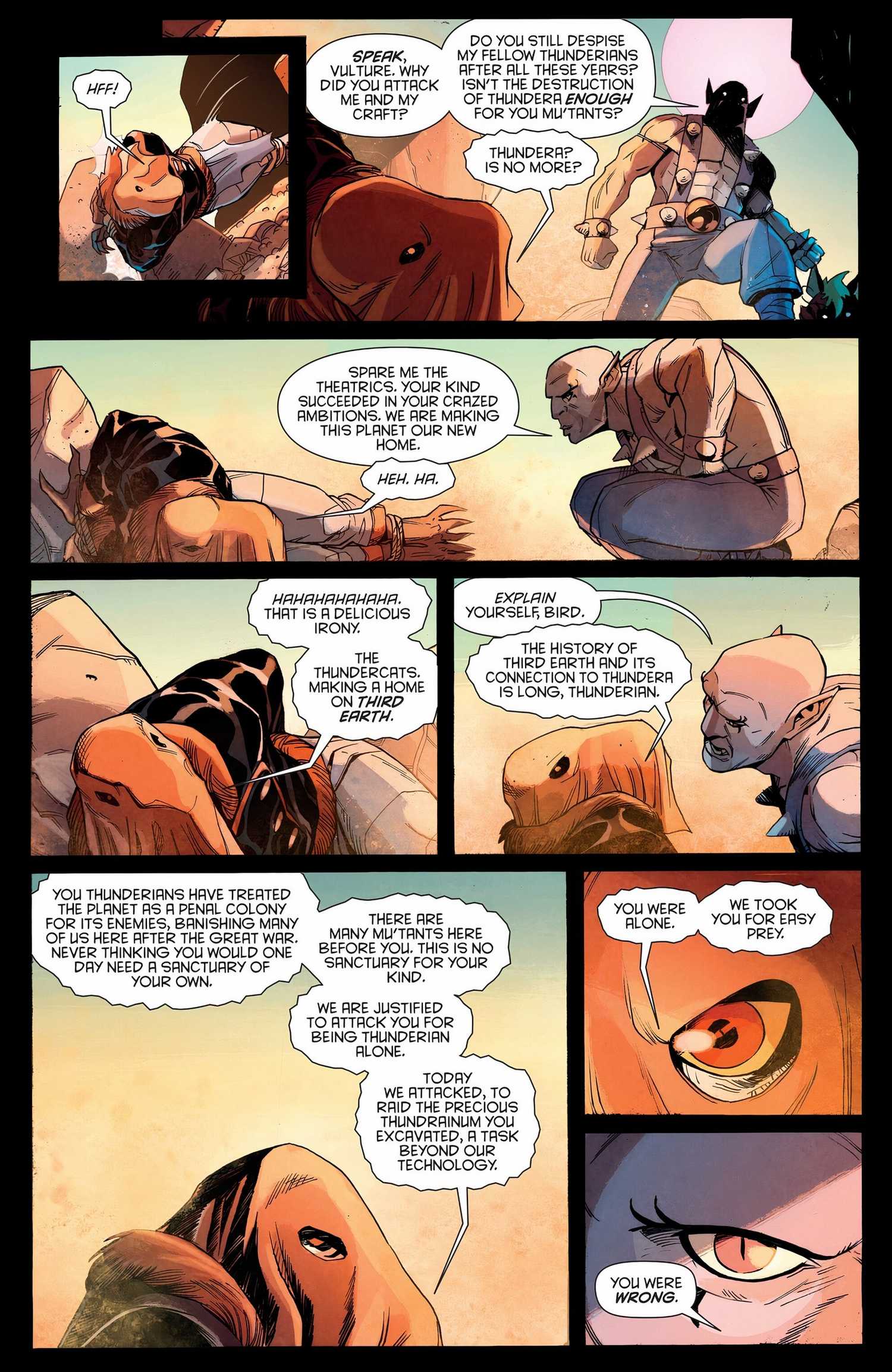 truenos El número 6 está escrito por Declan Shalvey y dibujado por Drew Moss. Panthro ha llevado el Thundertank a los desiertos de la Tercera Tierra para buscar una fuente de energía y aclarar su mente. Panthro es atacado por una banda de Vulturemen. Después de sacudirlos, Panthro logra capturar a uno e interrogarlo.