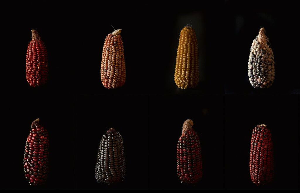 Muestra de variedades de maíz. En la fila superior, de izquierda a derecha: Rojo, Coralillo, Amarillo y maíz de ajo de hojas blancas y granos multicolores. En la fila inferior, Sangre de Cristo, Morado, Pinto rojizo y Rosa.Ana Hop