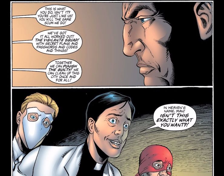 En Castigador vol. 5 #5 de Garth Ennis y Steve Dillon, se presentan otros tres vigilantes mortales de Marvel que se inspiraron claramente en Punisher. Uno de ellos era un hombre que se autoproclamaba representante de la clase trabajadora conocido como Payback que mata a miembros de la élite corporativa. Otro era un hombre llamado Elite que mataba a cualquier persona que consideraba ‘indeseable’ que entraba en su barrio de clase alta de Nueva York, estuvieran haciendo algo ilegal o no. El tercero, y el más violentamente aterrador de los tres, era un sacerdote que tenía una oscuridad dentro de él de la que no podía deshacerse ni siquiera a través de la fe. El sacerdote mataría a cualquiera que confesara crímenes verdaderamente terribles en lugar de asignarles penitencia (como si no fueran perdonados hasta que se entregaran). En lugar de tratar de detenerse, el sacerdote agradece a Dios que Punisher exista ya que su presencia lo hizo sentir menos aislado en sus tendencias homicidas.