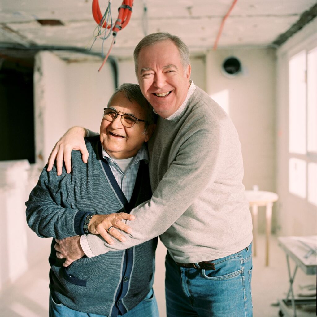 El edificio llevaba una década abandonado cuando se solicitaron las obras en 2018. Fue Federico Armenteros, en la foto con su pareja, Inocente Aguado, quien soñó esta nueva y casi inédita vida. Este educador social es también el presidente de la Fundación 26 de Diciembre, la cual ofrece cuidados para mayores de la comunidad LGTBI. “Después de todo, somos un sector que ha pasado por el maltrato de una dictadura, el estigma del sida y todas las calamidades posibles. Y cuando parecía que al fin teníamos algo que celebrar, nuestra edad ha sido el factor decisivo para caer en el olvido”, explica. “Por eso, una premisa que a algunos sonará marciana, como es crear una residencia pública especializada, que no exclusiva, en los cuidados del colectivo, para mí es tan sencilla como importante. La homofobia no mengua con la vejez, al contrario. Y un lugar donde pasar tus últimos años que te obligue a volver a un armario del que te has pasado una vida escapando es la peor derrota vital”.
