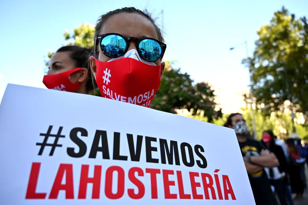 Uno de los manifestantes del sector de la hostelería, este miércoles en el centro de Madrid.GABRIEL BOUYS / AFPLa crisis del coronavirus ha puesto a la hostelería de España contra las cuerdas. Por ello, representantes de Hostelería de España, Hostelería de Madrid, Plataforma por el Ocio, España de Noche y más de 50 organizaciones provinciales se concentran este miércoles ante el Palacio de Cibeles mientras se celebraba el pleno del estado de la ciudad. El sector, con parte de sus negocios cerrados y otros muchos al límite, reclama más apoyo institucional y que se deje de culpar al sector como foco de contagios.La protesta ha comenzado a las once de la mañana y la organización ha instado a que se respeten las normas de seguridad. Una de las razones principales de la manifestación es “la excesiva culpabilización del sector, que se materializa en continuas restricciones, sin ningún tipo de medidas compensatorias”. Entre los más afectados en este sentido destaca el ocio nocturno, que ha ido variando las condiciones en que podían abrir en la nueva normalidad. Y denuncian que paga el colectivo al completo por lo que hacen mal unos pocos. En este sentido, España de Noche ha recordado que no existe evidencia de que los locales de ocio sean uno de los mayores factores de riesgo de contagio de coronavirus.José Luis Yzuel, presidente de la patronal Hostelería de España, ha insistido durante la concentración en el tremendo golpe sobre el tejido productivo y el empleo. “40.000 persianas han cerrado definitivamente y 400.000 empleos han desaparecido en nuestro sector. Basta de improvisación, necesitamos un plan de ayudas directo. Es el momento más delicado de la hostelería del país”. Además, ha lanzado un mensaje de socorro: “Somos un sector fundamental de la economía española y necesitamos una mejora fiscal, una bajada del IVA”.Entre los empresarios, tanto los de hostelería como los del ocio nocturno, alertan asimismo del incremento de los preconcursos de acreedores y demandas de desahucio. Una situación a la que se llega tras no haber podido trabajar durante el verano o tras hacerlo de forma muy limitada. Buen ejemplo de ello es el bar Preciados 38, cuyo propietario, Félix Malaquez, reconoce: “Lo veo muy difícil. He acumulado mucha deuda estos meses y puede llegar el momento en el que haya que cerrar”.Juan José Blardony, director de Hostelería de Madrid, ha destacado la necesidad de medidas como la extensión de las terrazas municipales, recuperar horarios de terrazas, peatonalización de las vías públicas y la recuperación de los centros de las ciudades como destinos turísticos, entre otros. Javier Olmedo, presidente de la Plataforma por el Ocio y la Cultura de Madrid, ha hecho especial hincapié en “el fracaso del plan de apoyo y rescate para las pymes del ocio y la hostelería de la capital. Una situación que, desgraciadamente, se ha reproducido en muchas ciudades de España”.Medidas concretasBajo el lema “Salvemos la Hostelería y los locales de ocio nocturno”, los concentrados han reclamado futuro para el sector hostelero, según han explicado los convocantes en un comunicado. En las zonas más turísticas y centro de grandes ciudades, el sector sufre la falta de viajeros internacionales ―y nacionales―. Mientras el resto trata de capear el temporal, aunque no todos lo consiguen con una caída muy fuerte de los ingresos. De hecho, el 62% de las empresas creen que la facturación no se recuperará, al menos, hasta 2022, según un estudio de KPMG y CEOE.Según las cifras que maneja el sector, dos de cada diez establecimientos ya han echado el cerrojo y se esperan nuevos cierres este otoño. Álvaro Bonastre, socio director de Foqus y uno de los responsables de otro estudio sobre el embate de la covid en la hostelería, incide en que el gran problema son las ventas, que siguen sin recuperarse, especialmente en Madrid y Baleares. “En septiembre prevemos más cierres que no van a poder ser rentables con la bajada de ventas que observamos”, opina Bonastre.Ante este escenario, Hostelería de España recoge una serie de demandas en un comunicado conjunto de los convocantes. Entre ellas destaca la puesta en marcha de medidas de apoyo higiénico-sanitarias, la ampliación de los ERTE hasta marzo de 2021, apoyo a las empresas del sector con recursos a fondo perdido y la ampliación de dos años en los periodos de carencia de la financiación recibida por el coronavirus, así como bonificaciones fiscales. Por último, recoge una serie de propuestas que estimulen la demanda: bonos a las familias, reducción temporal del IVA en la hostelería y un plan estratégico de la gastronomía.Bonificación de las terrazasDurante la protesta, las patronales han reclamado también al Ayuntamiento de Madrid en concreto “medidas de apoyo al empleo y medidas de apoyo a la estructura empresarial sectorial” para tratar de paliar el tremendo impacto de la covid sobre el sector. La concentración llega después de que la Confederación Empresarial de Madrid-CEOE solicitase al Consistorio ampliar la utilización flexible del espacio público para el funcionamiento de las terrazas hasta final de año. De esta forma pretenden impulsar la actividad del sector de la ciudad.Esta petición ha tenido respuesta en varios sentidos: por un lado, el martes la vicealcaldesa de Madrid, Begoña Villacís, dijo que es partidaria de alargar hasta final de año la ampliación de las terrazas. Y, por otro lado, el alcalde, José Luis Martínez-Almeida, ha anunciado este miércoles que el Ayuntamiento va a bonificar al 100% la tasa de terrazas para mitigar el impacto de la pandemia. “Tenemos que hacer un esfuerzo aún mayor”, ha asegurado en el pleno.Información sobre el coronavirus- Aquí puede seguir la última hora sobre la evolución de la pandemia- Así evoluciona la curva del coronavirus en España y en cada autonomía- Preguntas y respuestas sobre el coronav
